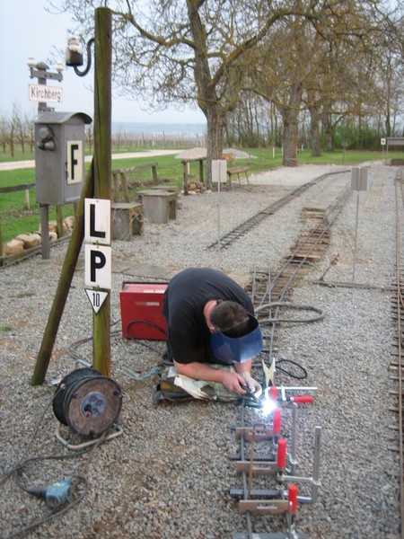 Die ersten Gleise und Weichen werden hier lose verlegt um den neuen Streckenverlauf zu bestimmen. Nach dem der Streckenverlauf bestimmt ist werden die Verbindungen der einzelnen Gleise und Weichen vorort auf der Anlage gefertigt. Hierdurch können die Übergänge und die Kurven besser bestimmt und ausgerichtet werden.